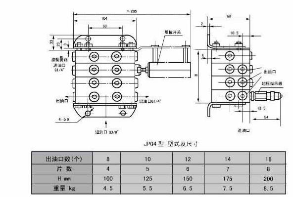 一、概述 JPQ-K系列(原ZP型)递进分配器适用于公称压力为16MPa的单线递进式干油集中润滑系统中,把润滑脂定量地分配到各个润滑点。 二、技术参数 三、外形尺寸 四、型号说明 五、使用说明 1.分配器为单柱塞多片组合结构,每片有两个出油口,分为JPQ1、JPQ2、JPQ3和JPQ4四种形式。 ①每种形式的分配器,一般按额定给油量相等的单片组合,需要时也可将额定油量不同的单片混合组合。 ②JPQ4型组合时需有一片控制片,此片无给油口。 ③相邻的二个或二个以上的给油口可以合并成一个给油口给油,此给油口的给油量为所有被合并给油口德额定给油量之和。 2.JPQ1型和JPQ2型分配器在系统中串联使用,JPQ3型和JPQ4型分配器在系统中并联使用。 3.分配器均装有一个运动指示杆,用于观察分配器工作情况。根据需要还可以安装限位开关,对润滑系统进行控制和监视。 4.JPQ2型、JPQ4型分配器根据需要可以安装超压指示器。 六、订货须知 同种型式、额定给油量不同的单片混合组合或多个出油口合并给油,订货时须另行说明。