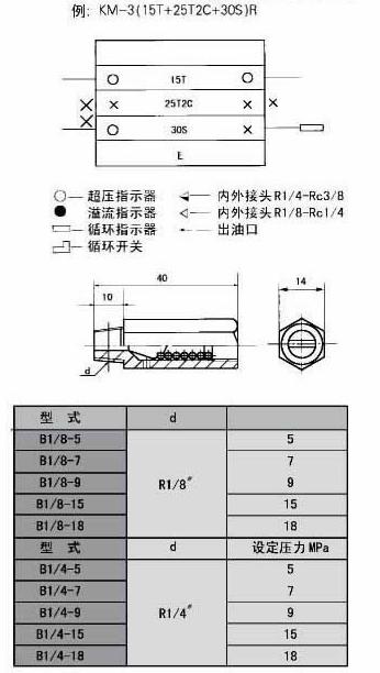 一、 概述 KJ、KM、KL系列单线递进式分配器,适用于润滑点密集、耗脂量不同、给油频繁单线集中润滑系统中,组成子母式分配系统实现分区控制进行润滑的场合。 KJ、KM、KL系列单线递进式分配器,它由中碳合金结构钢制造的供给体,端部体和3-8片根据设计需要所确定的给油量和出油口数的中间体组合而成。分配器的正常出口设置于分配器的两侧面,左上面还设置有预备出口,各中间体的出油口内均装有止回阀,能彻底防止因润滑点背压作用而产生润滑脂的逆流,保证了各出油口的给油量定量、准确。 二、技术参数 三、动作说明 四、外形尺寸 五、型号说明 六、超压指示器 安装于分配器的预备出口,当润滑点或管路阻塞时,压力升高超过规定值时,指示器外部稍伸出。通过系统发出的故障信号,现场查找指示器有否伸出就可直接查到所阻塞的部位。 七、溢流指示器 安装于环境恶劣易发生阻塞部位的各分配器预备出口上,当润滑点或管路阻塞时,压力异常升高超过规定值时,分配器被阻塞点的所供脂从溢流口向外溢出,经查看溢流点即为被阻塞的故障点。 只适用于连续作业部位,不许影响其它分配器动作的场合。 八、订货须知 订货时用完整的型号订购并提供联接示意图。