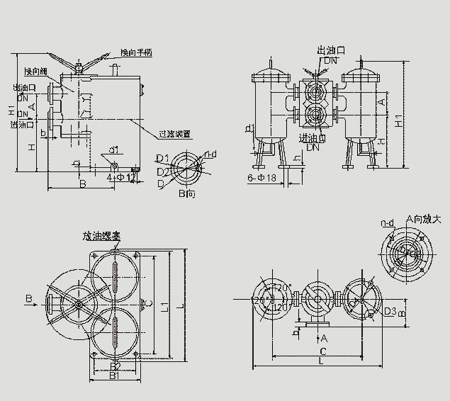 一、概述 产品适用于公称压力为0.6MPa的稀油润滑系统中,用以过滤污垢杂质,提高润滑油的清洁度,小型的为整体式,较大的为组合式,分别由二组过滤筒和一个三位六通换向阀组成,工作时一组过滤筒工作,另一组过滤筒备用,可实现不停车切换过滤筒,达到循环润滑不间断工作的目的。 二、技术参数 三、外形结构及尺寸 SLQ-32,SLQ-40双筒网式过滤器(整体式) DN≥50的SLQ型双筒网式过滤器(组合式) (续上表) 四、型号标注说明